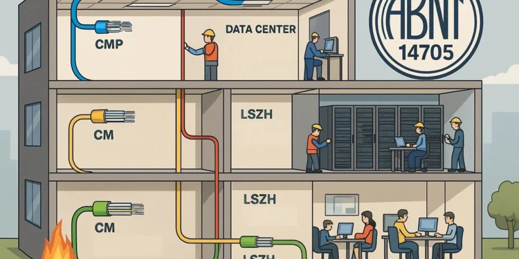 A NBR 14705, intitulada “Cabos internos para telecomunicações – Classificação quanto ao comportamento frente à chama”, é uma norma técnica crucial para a segurança contra incêndios em instalações de telecomunicações no Brasil. Elaborada pela ABNT (Associação Brasileira de Normas Técnicas), sua última revisão ocorreu em 2010, incorporando práticas avançadas de segurança e alinhando-se com padrões internacionais. É importante notar que a ABNT é o órgão responsável por criar e atualizar as normas técnicas brasileiras, garantindo que elas reflitam o estado da arte em termos de tecnologia e segurança. Ainda em 2025, deverá ser publicada a mais nova revisão dessa norma, com novidades especialmente em relação à classificação LSZH (leia mais abaixo).